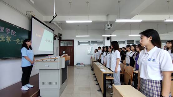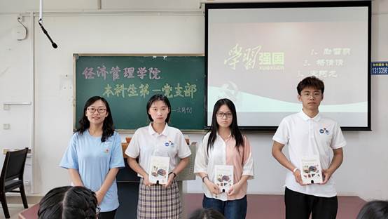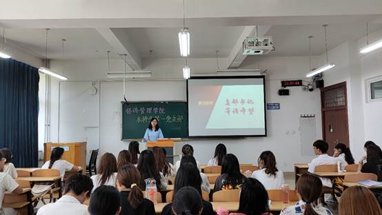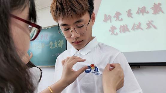 礼毕,支部书记为新党员佩戴党员徽章。党徽是党员的身份和标志,今年5月11日支部发展了第一批党员。为了让新党员铭记入党誓词,铭记身上肩负的责任与担当,李老师逐一为新党员佩戴党员徽章,让大家清晰记忆这一神圣庄严的时刻。经济与金融19-3班徐明燕、会计学19-2班马可心作为新党员代表发言,两位同志从入党初心出发,讲述了加入党组织的心路历程,她们一腔热情、勤奋刻苦、追求卓越的优良品质深深的感染了在场听众,真情实感的流露向大家传递了满满的正能量。